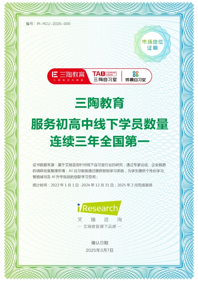 近日艾瑞咨询正式授予三陶教育“服务初高中线下学员数量连续三年全国第一”认证。这一认证基于对行业数据的深度分析及企业服务能力的综合评估,充分肯定三陶教育在技术创新、规模覆盖及教育普惠方面的标杆地位。
