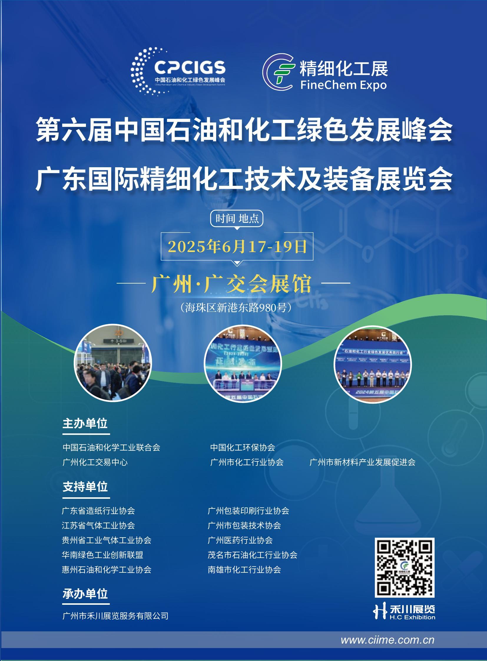 组织单位将于2025年6月17-19日在广州广交会展馆举办“广东国际精细化工技术及装备展览会”同期同地举办“GCEC第六届中国石油和化工绿色发展峰会”,通过会+展的形式前晚行业未来,展示精细化工行业新产品,新技术,新装备,新材料,新成果,推动广东精细化工转型升级,助力精细化工行业高质量发展。